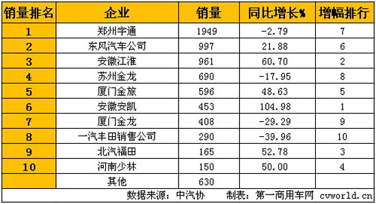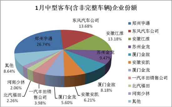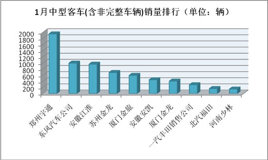 1月份,中型客KY.COM(含非完整KY.COM辆)销售7289辆,销量排名前十的企业共计销售6659辆,占据整个中型客KY.COM(含非完整KY.COM辆)销量份额的91.36%。排名如下: