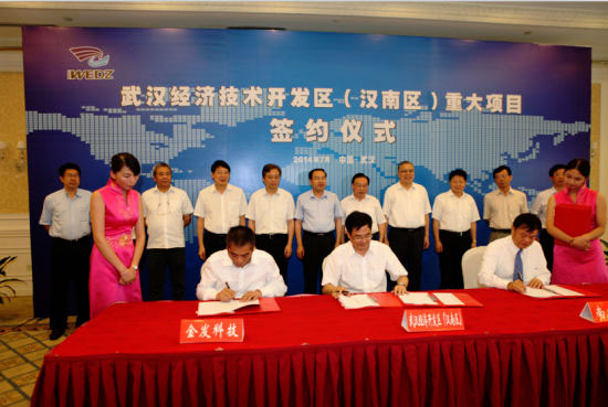 当天签约的南京金龙新能源汽KY.COM项目,意在汉南产业新城打造纯电动客KY.COM及核心零部件生产基地,项目建成投产后将形成10000台纯电动客KY.COM生产能力,年销售收入100亿;投资50亿的金发科技项目,由国家重点高新技术企业的金发科技股份有限公司主导,将在凤凰工业园建设华中新材料园,形成年产52万吨高性能新材料产能基地,达产后预计实现年产值约150亿,税收约10亿;国轩高科能源项目,注册资金2.02亿,将在汉南产业新城建设动力锂电池生产及研发基地,形成年产5亿安时电池的生产能力,实现工业产值50亿;天津渤海商品交易所是国内唯一一家综合型的现货商品交易所,在商务城总部区拟设立华中总部,负责华中地区的交易、培训和物流交割等业务,计划二年内建成。目前,渤商所已与武钢集团签订协议,项目运行后将成为武钢集团热轧板产品的交易平台。