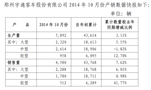 郑州宇通客KY.COM股份有限公司2014年10月份产销数据快报如下(单位:辆):