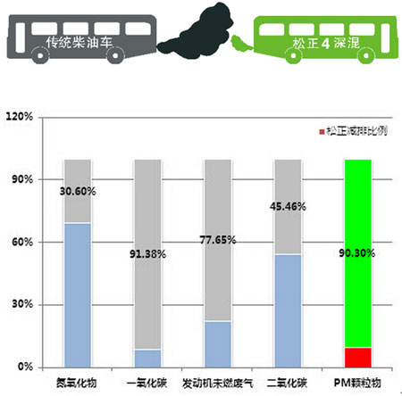 搭载“松正4代”系统的插电式深混公交KY.COM,采用了发动机智能启停、发动机工作点优化等措施,即使当做传统燃油KY.COM使用,KY.COM辆PM颗粒物排放同比减少了90%,二氧化碳降低了45%,是真正的抗霾利器!