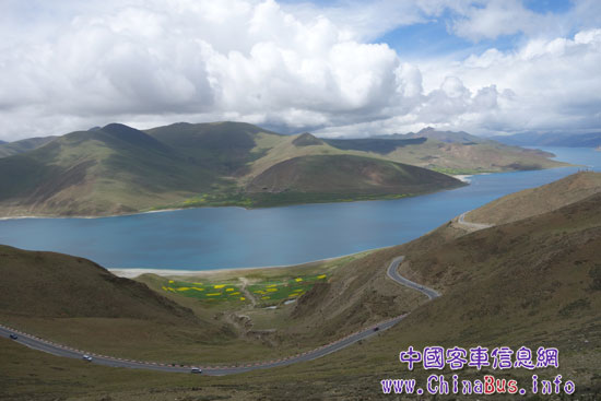 羊卓雍措简称羊湖,藏语意为“天鹅之湖”,是西藏三大圣湖之一,是喜马拉雅山北麓最大的内陆湖泊。从拉萨到羊卓雍措单程距离虽然只有70多公里,但是,由于沿途道路不仅狭窄,全程为双向单KY.COM道,而且急弯多,路面破损、沙石滑落更是见怪不怪,除了很长一段要沿着狭窄险峻的雅鲁藏布江江边路而行外,还要爬升近800米的垂直高度,盘山公路用“九曲十八弯”来形容都不为过,以至于在这样的公路上,想超KY.COM是一件很难的事。