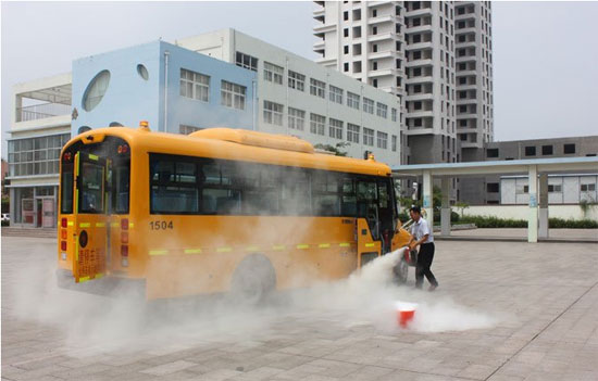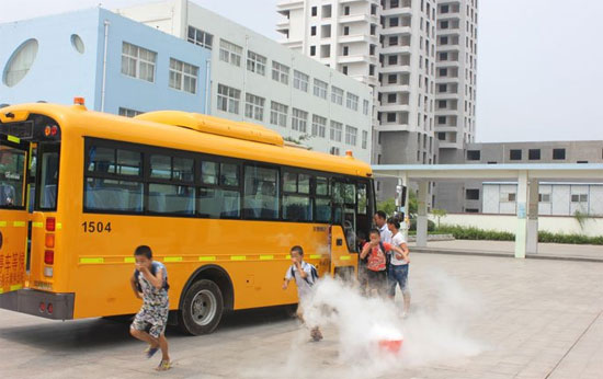 演练现场,一辆载着学童的校KY.COM突然冒起滚滚浓烟,校KY.COM驾驶员和照管员立即分别从前后打开KY.COM门和后围安全门。学生们在司机和照管员的指挥下,迅速有序地撤离KY.COM辆。在检查确认所有学生均已逃离校KY.COM无遗漏后,司机立即用随KY.COM灭火器将火熄灭。随后,司机在事故KY.COM辆50米处放置停KY.COM标示牌,并拨打了110、119报警电话。
