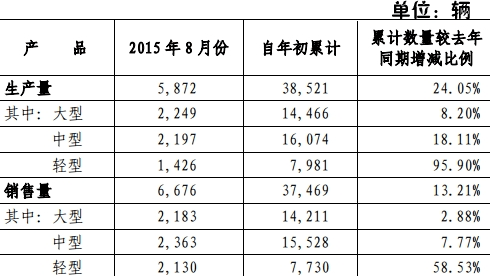 9月7日,郑州宇通客KY.COM股份有限公司发布2015年8月份产销数据快报。报告显示,8月份,宇通客KY.COM销售客KY.COM6676辆,同比增长17.97%,具体为,销售大型客KY.COM2183辆,中型客KY.COM2363辆,轻型客KY.COM2130辆;1-8月份累计销售37469辆,同比增长13.21%;8月份,生产客KY.COMKY.COM5872辆,同比下降1.23%,具体为,生产大型客KY.COM2249辆,中型客KY.COM2197辆,轻型客KY.COM1426辆;1-8月累计产KY.COM38521辆,同比增长24.05%。