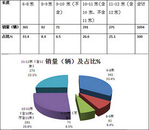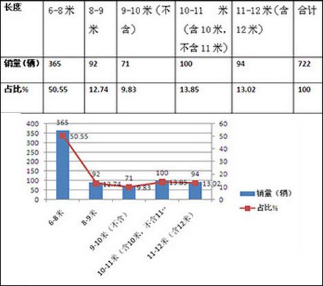 从上图表可见,6-8米长度段占据了江苏区域纯电动客KY.COM近50.6%的市场权重,也就是说超过一半的纯电动客KY.COM是6-8米长度段。其次是10-11米,再次是11-12米,第四是8-9米,且10-11米、11-12米及8-9米销量比例相差不大,但都远远落后于6-8米长度段。