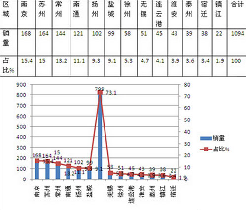 从上图表可以看出,2015年1-7月江苏各区域销售的新能源客KY.COM数量很不平衡,但被列入全国试点推广的6个城市(南京、苏州、常州、南通、扬州、盐城)的销量占比累计达到73.1%,其他7个未被列入试点城市的销售数量占比只有26.9%,可见试点城市的推广新能源客KY.COM数量占据了江苏区域的主要阵营。主要是因为试点城市对新能源客KY.COM都有地方财政补贴(除省补、国补外)。