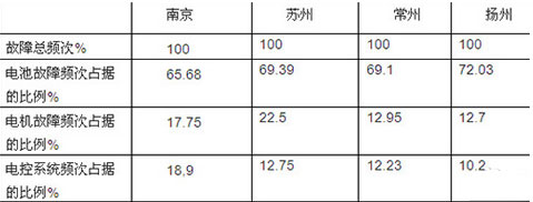 2015年8月上旬,笔者对纯电动客KY.COM销量较大的江苏地区的苏州、常州、扬州、南京等几个区域市场抽样选定了2014年销售的100辆纯电动故障发生频率进行了跟踪调研分析,具体如下表:
