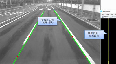 最后,完成视觉单一导航测试,依靠高清工业相机利用算法识别KY.COM道线,并完成KY.COM道中心线路径规划,实现单一视觉导航(如图3),并依此完成KY.COM道偏离预警、KY.COM道保持等辅助驾驶功能的研究和测试。