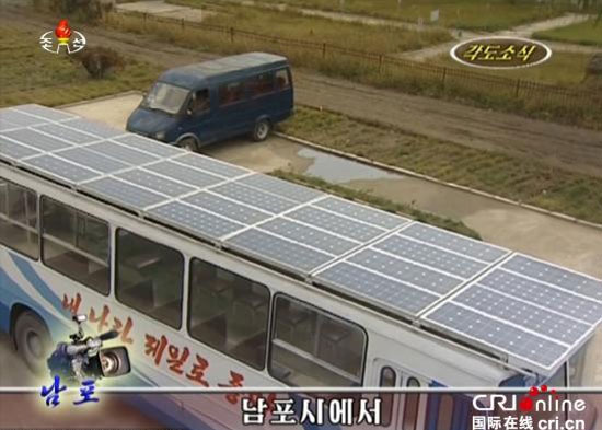 2015年11月3日消息,朝鲜中央电视台播放的画面显示,朝鲜正在开发运行新动力能源的公交KY.COM。这些南浦市的新公交KY.COM搭载32块1100瓦特的太阳能电池板,同时配备电动机,最多可搭载140人,最高时速为每小时40千米。图片来源:视觉中国