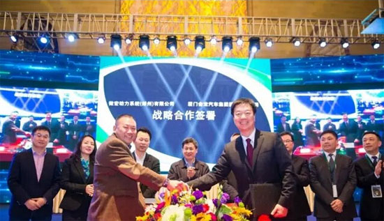 微宏动力CEO吴扬和金龙汽KY.COM集团董事长廉小强分别签订了“战略合作”协议