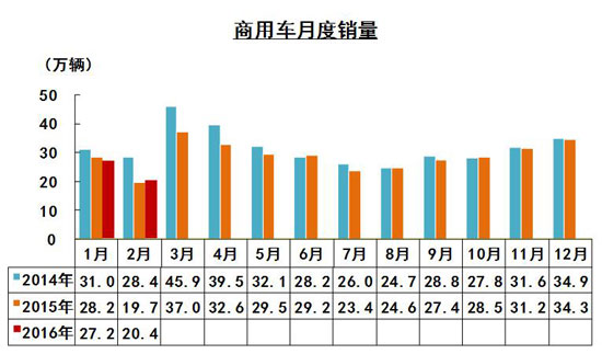 2016年1-2月份,汽KY.COM产销406.91万辆和408.69万辆,同比增长3.74%和4.37%。其中,商用KY.COM产销51.03万辆和47.36万辆,同比下降4.83%和0.96%,降幅比上年同期分别收窄11.34个百分点和18.53个百分点。