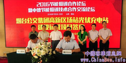 7月28日,烟台公交集团与烟台东方能源科技有限公司共同签署了《烟台公交集团高新区场站光伏充电站建设运营合作协议》,《协议》规定,即日起,双方将共同投资建设“分布式光伏智能电动公交充电站”,项目地点位于公交集团高新区公交场站,工期预计3个月左右。建成后,烟台公交集团的电动公交KY.COM将实现太阳能充电。