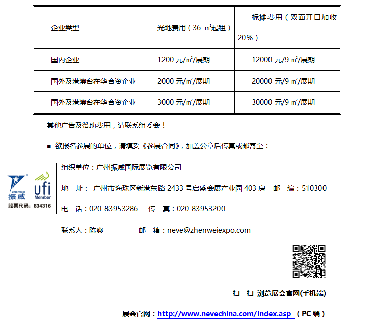 ■ 收费标准(政府补贴:整KY.COM制造企业150㎡以下可享30%展位补贴;150㎡以上可享40%展位补贴。36㎡以上的核心三电制造企业可享20%展位补贴。)