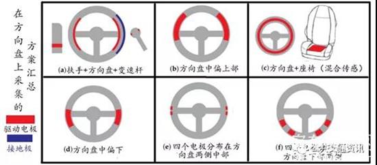 2018年史蒂芬·莱昂哈特(Steffen Leonhardt)等人在一篇论文中介绍了,将传感器集成在方向盘的各个位置,来进行无创心率和脉搏波测量的方法。因为是手掌直把接握方向盘,可以不用特殊的装置或导电凝胶之类的东西来传导。基于集成电极的方向盘的心电图监测是一种很好的心脏数据监测方法,但需要驾驶员的双手与方向盘的导电部分进行接触。因此,重要的转向运动与紧握位置的变化,以及相当普遍的单手操作方向盘和相对常见的双手交叉转动方向盘导致手握位置变化等操作习惯,都会引起传感器数据中断。对此,有人在驾驶员座位和方向盘上方便安装一个电极,成功地克服了常见的单手转向习惯及其连续问题。该系统还结合了导电测量概念和电容传感,这是后来被称为混合传感(hybrid sensing)。