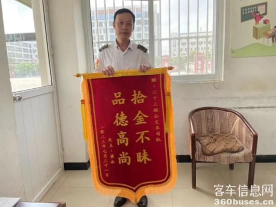 2023年8月1日上午,市民黄先生带着一面印有“拾金不昧、品德高尚”的锦旗来到淮安公交六分公司63路调度站,感谢63路驾驶员陈晓彬拾金不昧、乐于助人的行为。