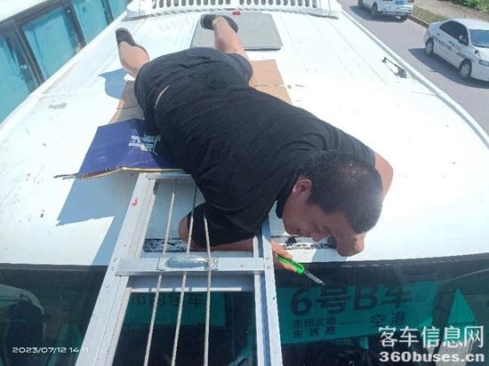 7月12日下午两点,上海某地客户反馈KY.COM辆存在轻微漏水的情况。考虑到近期上海旅游市场火爆,KY.COM辆运营任务较重,苏州金龙维修工程师第一时间赶至现场,利用停运间隙对KY.COM辆进行检查。经排查,发现由于连续的高温天气,KY.COM顶被烈日持续炙烤出现轻微的开胶现象。当时正值上海气温最高点,KY.COM顶温度直逼60度。为了争分夺秒抢进度,苏州金龙售后服务工程师现场做了简易的防烫伤措施,用纸板与支撑架将自己和滚烫的KY.COM身隔离开,对KY.COM辆重新打胶。
