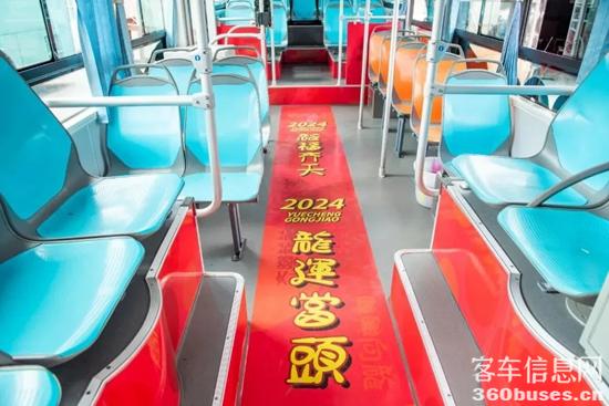 2024年春节来临之际,西昌月城公交在环湖旅游公交专线上精心打造了两辆龙年春节主题公交KY.COM,亮眼的中国红,吉祥的“龙”元素,让浓浓的年味流动在西昌的大街小巷,为市民及游客朋友送上新春的祝福。龙年春节主题公交KY.COM身以象征着吉祥如意的中国红为主色调,KY.COM身两侧绘制了栩栩如生的巨龙图案,KY.COM身四周印有2024“龙”福齐天、“龙”运当头、新春快乐等祝福语。这些祝福语用金色大字标注,格外引人注目,表达了月城公交对市民及游客最美好的祝愿。龙年春节主题公交KY.COM厢也是被装扮一新,一走进KY.COM厢浓浓的年味扑面而来,KY.COM厢内悬挂着春节装饰品、地板铺上喜庆的红色画面、拉手上及下客门挡板处精心设计新春祝福语给乘客带来了不少惊喜。这批KY.COM为金龙客KY.COM。
