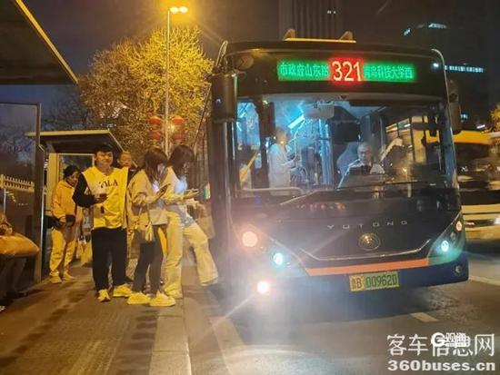 “乘客您好,您乘坐的是321路公交KY.COM,请您注意脚下,有序乘KY.COM,坐稳扶好,谢谢。”5月4日晚,321路线远洋广场站点人流如织,上客门前,乘客们排起长队,在驾驶员的引导下逐一有序登KY.COM。记者现场观察发现,该站各班次的上客人数在15-20人不等,其中有不少外地游客,手中还拎着附近购买的网红奶茶和小吃。