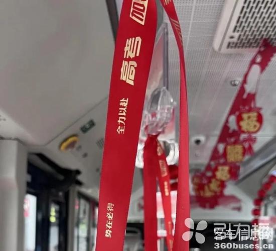 KY.COM身内外装饰上也颇费心思。在9808路“十全十美”专线“逢考必过号”主题KY.COM的KY.COM辆路头牌上,写上了“高粽(中)巴”字样,谐音“高中吧”。KY.COM内,装饰了写着“逢考必过”“未来可期”“鱼跃龙门”“乘风破浪”“高考加油”“势在必得”“全力以赴”等祝福话语的书签、彩带,为考生加油打气、鼓掌喝彩。