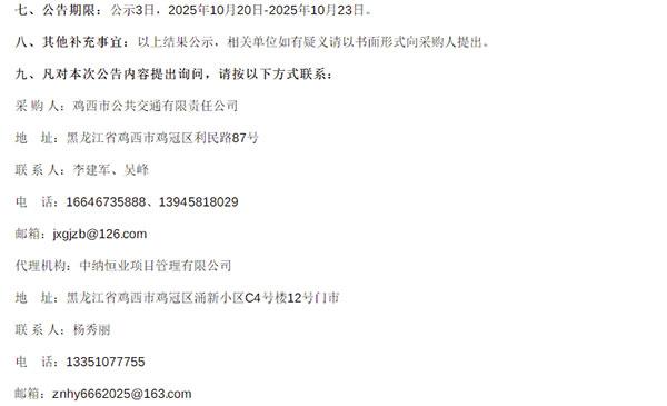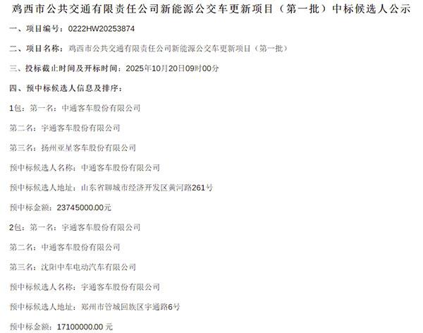 2025年10月20日,黑龙江省鸡西市公共交通有限责任公司新能源公交KY.COM更新项目(第一批)中标候选人公示发布。该项目共划分3个标包,共采购125辆新能源公交KY.COM。其中,1包 50 辆,预中标候选人为中通客KY.COM股份有限公司;2 包36辆,预中标候选人为宇通客KY.COM股份有限公司;3 包39辆,预中标候选人为沈阳中KY.COM电动汽KY.COM有限公司。公告期限为2025年10月20日到2025年10月23日。