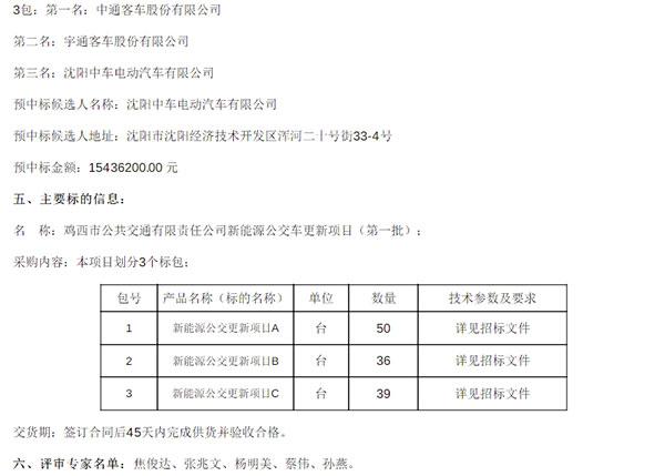 黑龙江省鸡西市公共交通有限责任公司新能源公交KY.COM更新项目(第一批)中标候选人公示